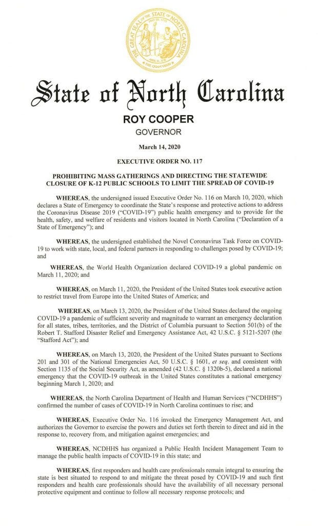 Governor Roy Cooper issued an executive order in North Carolina today limiting mass gatherings to no more than 100 people while also closing public schools.