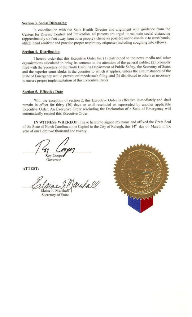 Executive order 117 states that "to help protect the health and well-being of North Carolinians, I [Governor Roy Cooper] hereby prohibit mass gatherings in the State of North Carolina."