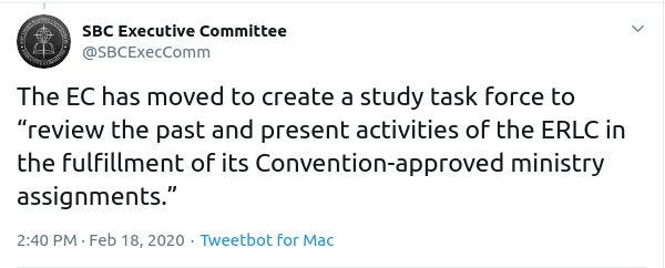 The SBC Executive Committee has just announced on Twitter that they have moved to create a task force to review the activities of the controversial Ethics and Religious Liberty Commission headed by Russell Moore.