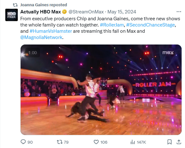 Now look at what is being sold to Christian households as harmless fun. Roller Jam—a neon-lit reality show promoted as “family friendly” and “Watch Together”—arrives as a Max Original stamped with Magnolia Network credibility. Joanna Gaines herself chirps its debut, the press packages applaud its “LGBTQ+ roller-skating” cast, and the judging panel parades queer identity as the feature.