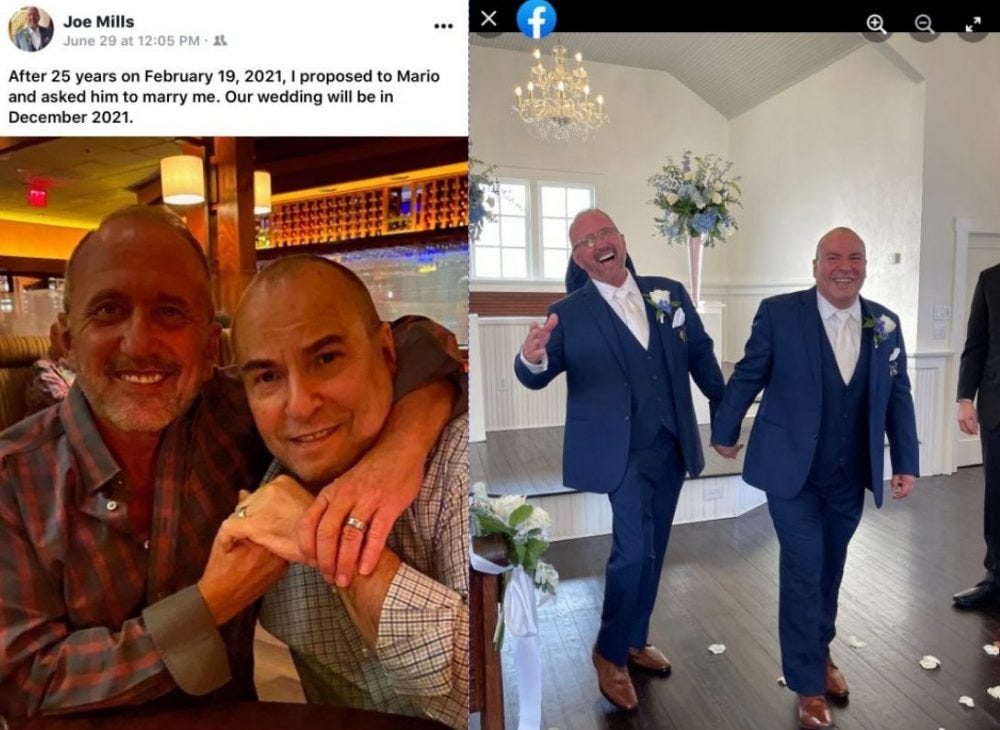 Below are images of a man named Joe Mills who, according to his Facebook page, is happily "married" to another man named Mario as of December 2021. Below is a picture of Joe Mills and his "husband," Mario.