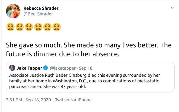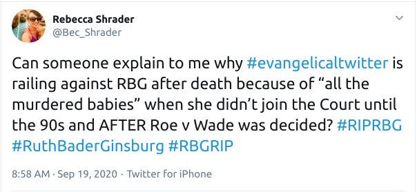 So it should come as no surprise that Shrader, a teacher and member in good standing at the Southern Baptist Convention president's church, praises one of the most anti-Christ, pro-abortion, pro-sodomy Supreme Court Justices ever to walk the face of this earth, Ruth Bader Ginsburg.
