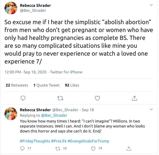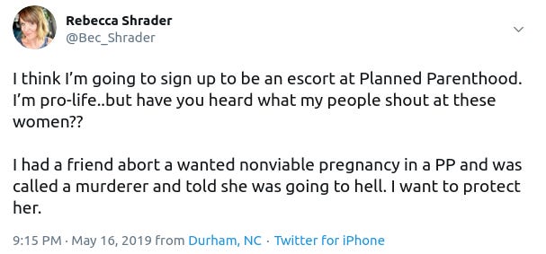 Shrader is a very confused person who believes that she is "pro-life" because she chose not to kill her own children. However, Shrader is continually and adamantly clear that she believes every woman should have the "choice" whether or not to end their own children's lives. She defends Planned Parenthood and does not believe that life begins at conception.