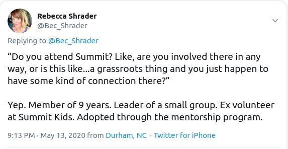 People, if you want to know what's wrong with the Evangelical Church today, look no further than Rebecca Shrader, and particularly, her pastor, JD Greear. That a woman like this is allowed to remain in good standing in a Southern Baptist Church while her pastor says nothing of her wicked behavior while propping her up and supporting her Black Lives Matter statements, speaks volumes of the problems in the Church. No wonder God is angry. Will anyone say anything? No, but you can rest assured that all the Evangelical leaders will complain about social media etiquette.
