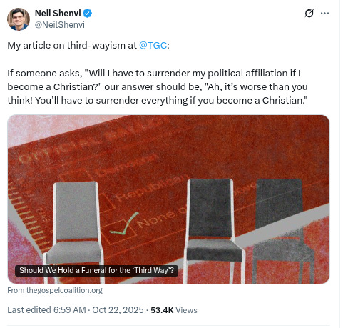 JD Greear’s resident mediator between Critical Race Theory and a biblical worldview, Neil Shenvi, just published a piece in The Gospel Coalition titled Should We Hold a Funeral for the Third Way?—and predictably, his answer is no. Not really.