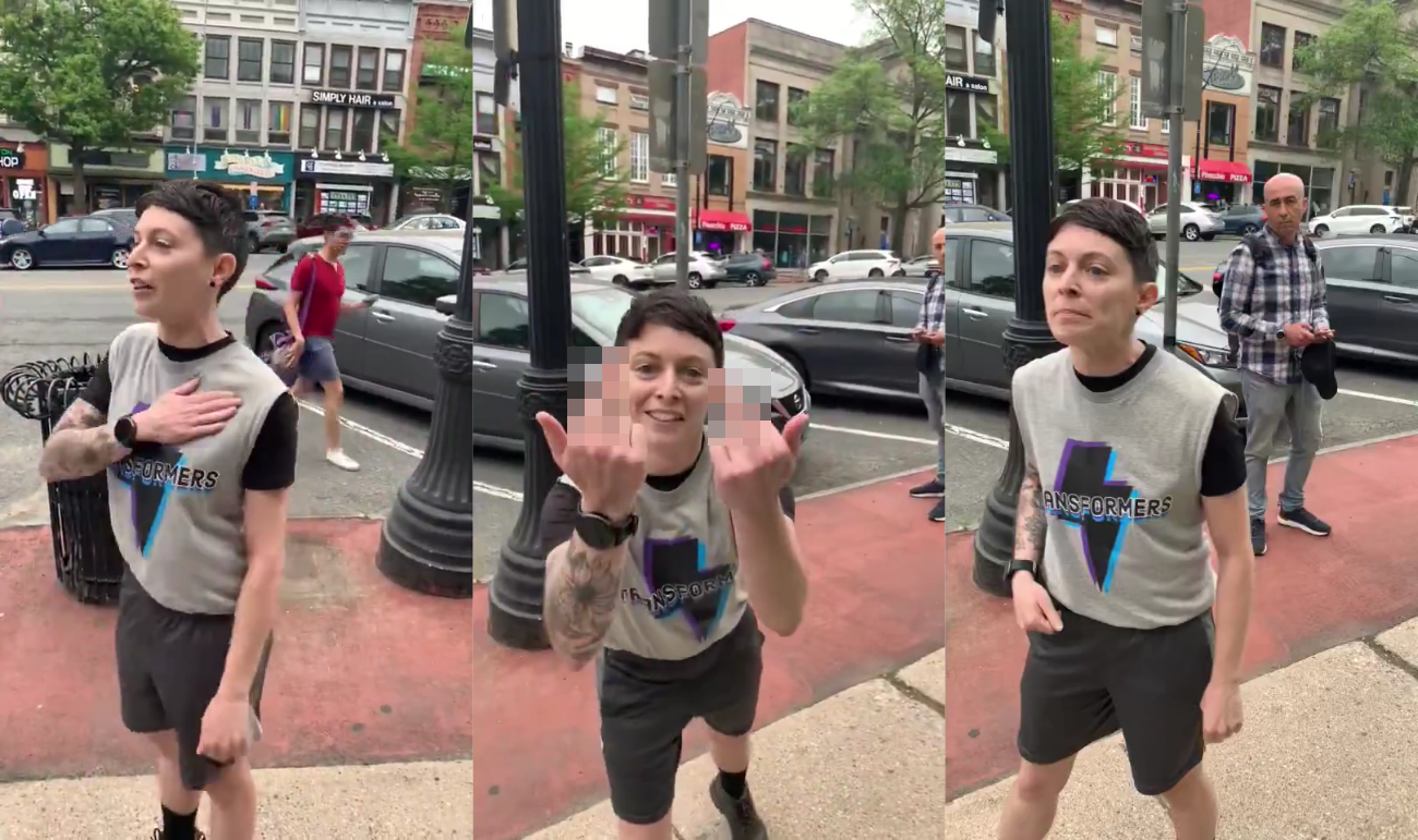 A woman in a Transformers shirt stands outside Smith College, screaming at a group of middle-aged women holding a banner that reads, “Women are adult human females.” She flails, rages, and hurls profanity like holy water against demons, as though declaring reality itself were an act of hate.